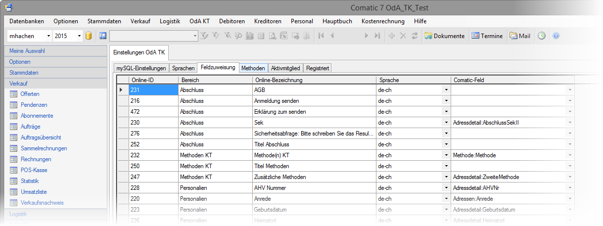 Hier wird definiert, welche Felder des Online-Formulares in welche Felder in Comatic importiert werden. Dabei müssen die Zuweisungen für jede Sprache getätigt werden.