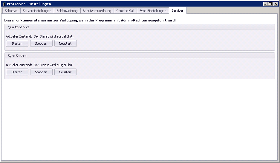 Das Register Dienste dient zum Überwachen bzw. Verwalten der zwei Dienste von ProIT Comatic-Connector. Es handelt sich dabei um die folgenden zwei Dienste:
