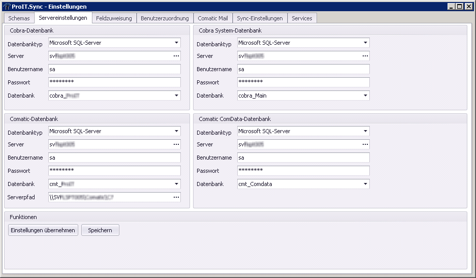 Um die Eingabe zu vereinfachen, wenn alle Datenbanken auf dem gleichen Server liegen, können die nötigen Einstellungen kopiert werden. Dazu müssen lediglich die Einstellungen in der Gruppe Cobra-Datenbank vorgenommen werden. Mit einem Klick auf Einstellungen übernehmen werden diese dann in die drei weiteren Einstellungsgruppen übernommen.