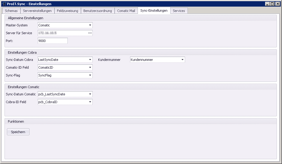 Die Felder „Sync-Datum Comatic“ und „Cobra-ID Feld“ werden automatisch in der Comatic-Datenbank erzeugt, sobald die Erweiterung „ProIT Cobra Schnittstelle“ im System installiert wurde. Anschliessend können hier die entsprechenden Felder ausgewählt werden.