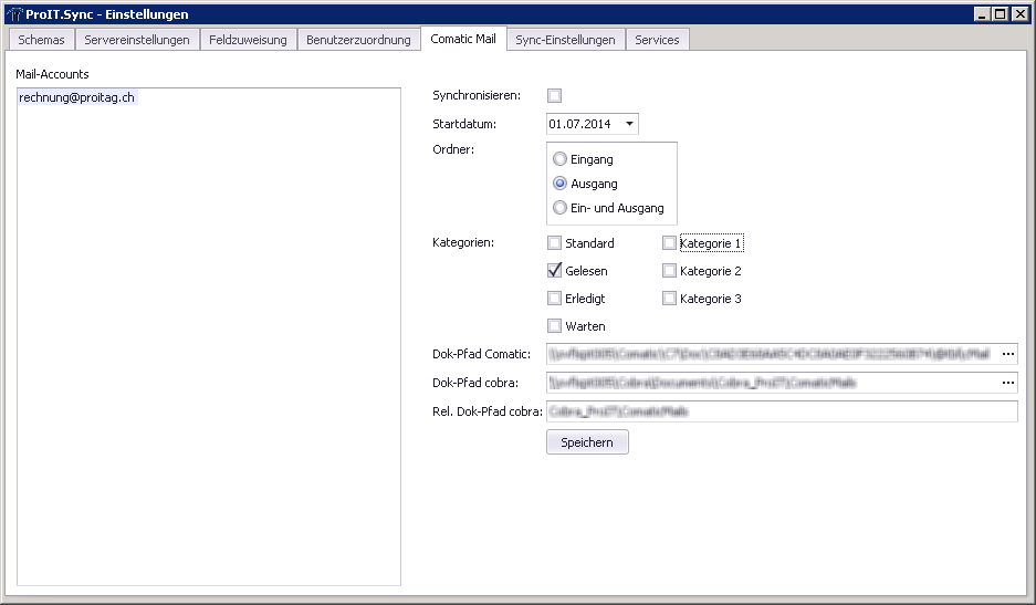 Der Pfad im Feld „Dok-Pfad Comatic“ muss auf das Verzeichnis zeigen, in welchem die Mailanhänge abgelegt werden (Schema: SERVERPFAD\Comatic\Doc\DB-GUID\@tbl\cMail).