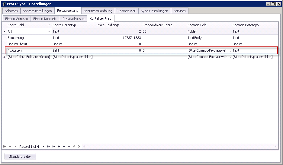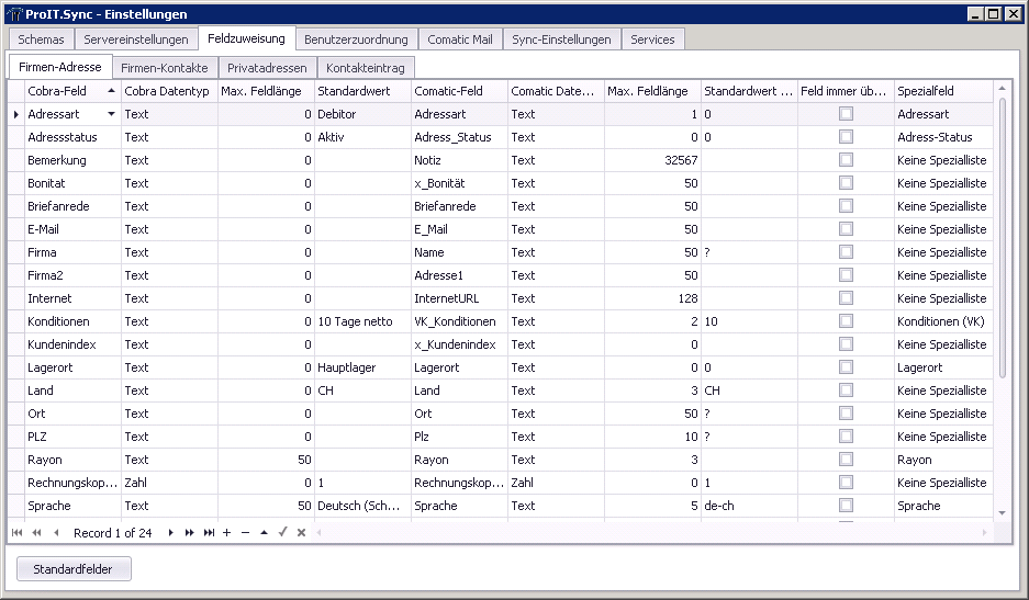 Im Register „Feldzuweisung“ werden die effektiven Felddefinitionen hinterlegt. Es ist dabei zu beachten, dass nur Felder mit vergleichbaren Datentypen synchronisiert werden können. Mit einem Klick auf den Button „Standardfelder“ werden für alle 3 Kategorien eine Standardliste geladen.
