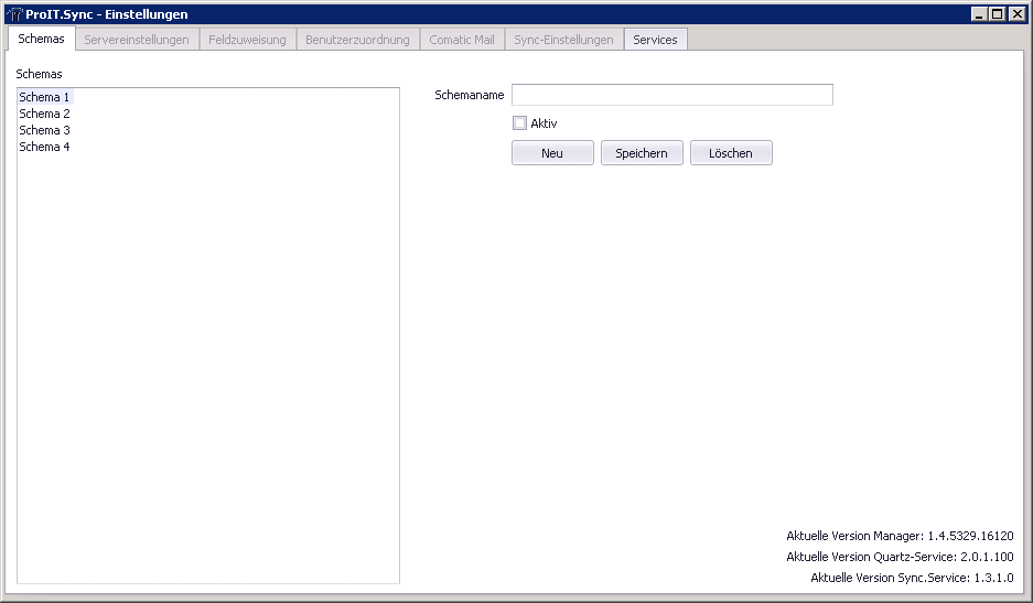 Für jede cobra- und Comatic-Datenbank, welche miteinander synchronisiert werden sollen, muss ein Schema erstellt werden. Bitte beachten Sie, dass eine Comatic-Datenbank jeweils immer nur mit einer cobra-Datenbank (und umgekehrt) synchronisiert werden kann. Es ist also nicht möglich, eine Comatic-Datenbank mit mehreren cobra-Datenbanken zu synchronisieren.