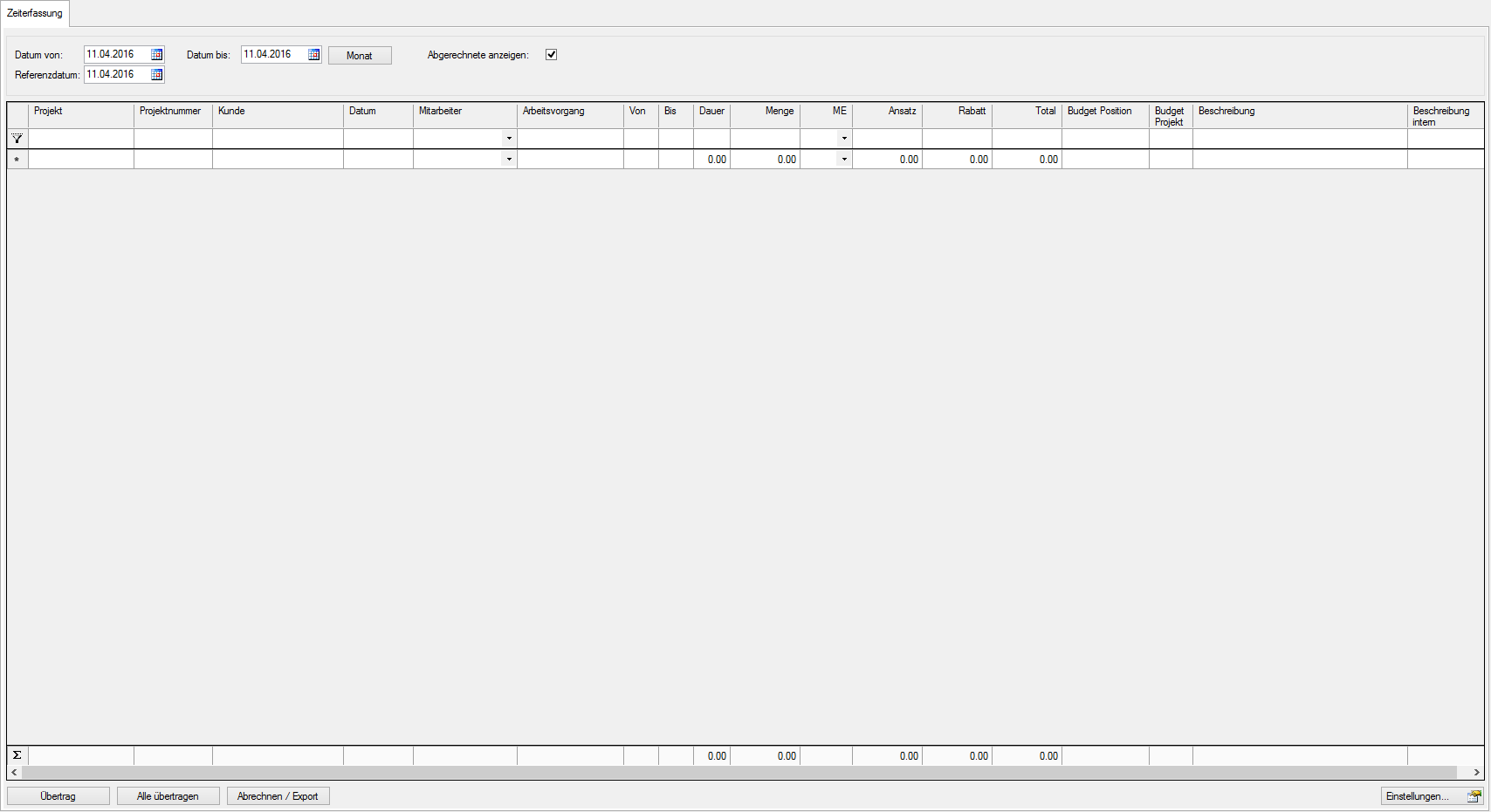 Ist die Checkbox Abgerechnete anzeigen aktiviert, werden auch die bereits abgerechneten Zeiten angezeigt.