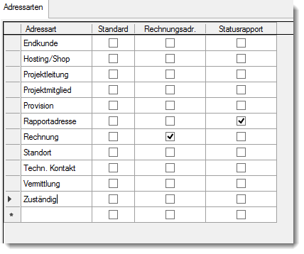 Erfasst)Archiv)Analog dem Status können verschiedene Typen von Adressen dem Projekt zugeordnet werden. Der Adresstyp wird dabei durch eine Adressart definiert. Bitte erfassen Sie mindestens folgende Adressarten im Menupunkt Projektverwaltung, Adressarten: