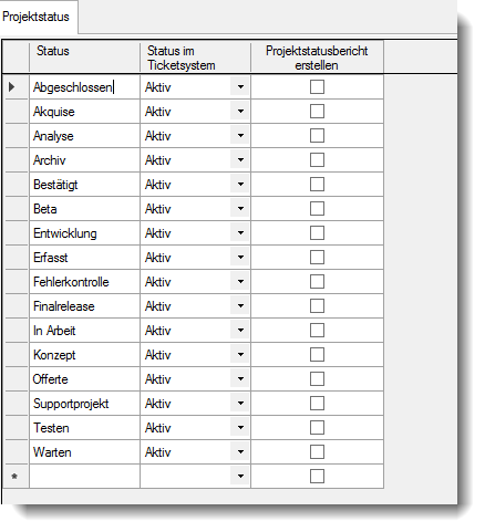 Die verschiedenen Projektstatus können frei definiert werden, einige Status müssen dann in den Einstellungen konfiguriert werden da sich das System je nach Status anders verhält. Bitte erfassen Sie mindestens folgende Status im Menupunkt Projektverwaltung, Status: