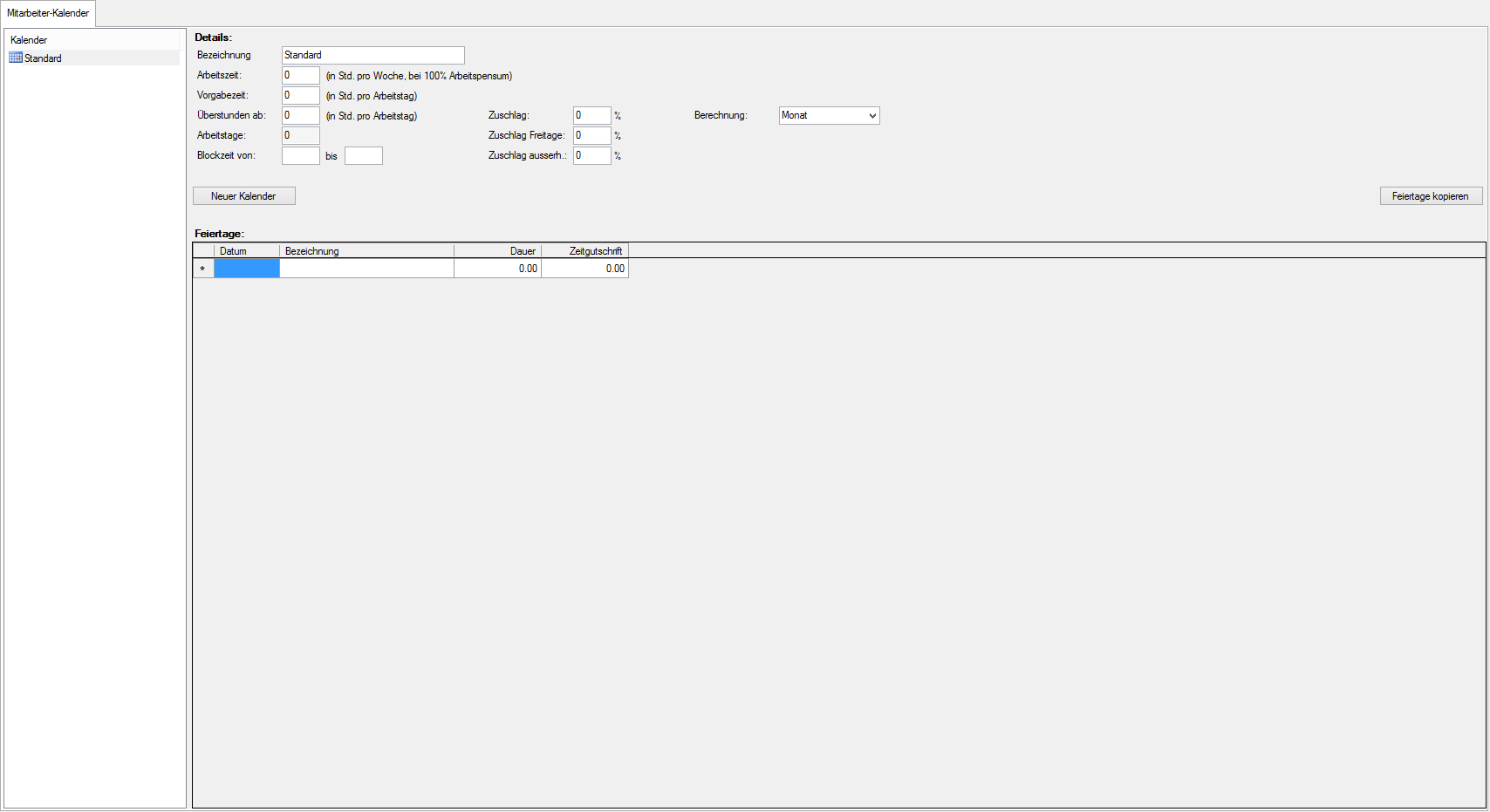 Sie haben die Möglichkeit je nach Arbeitsmodell mehrere Mitarbeiter-Kalender anzulegen (z.B. Standard, Stundenlohn, 60% etc.). Unter Feiertage können die Ereignis- und Feiertage mit den dazugehörigen Zeitgutschriften festgelegt werden.