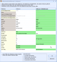 Sollen Felder aus der zu löschenden Adresse übernommen werden (in diesem Beispiel „AnPerson“, „Anrede“, „Staat“ und „Symbol“ kann auf den entsprechenden Eintrag in der Zeile ein Doppelklick ausgeführt werden. Es werden immer die grün hinterlegten Werte in die Adresse übernommen.