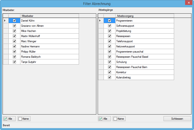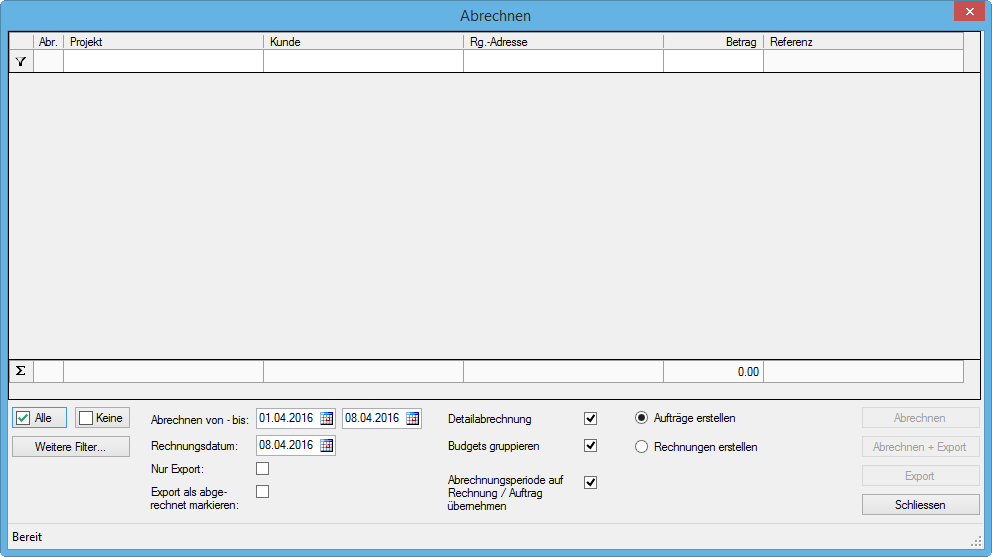 Mit Abrechnen/Export öffnet sich das Fenster Abrechnen. In der Auflistung werden alle Projekt angezeigt die abgerechnet werden können. Mit Alle werden alle Projekte in der Liste markiert und mit Keine werden diese wieder aufgehoben. Die Projekte können auch einzeln mit der Maus markiert werden.