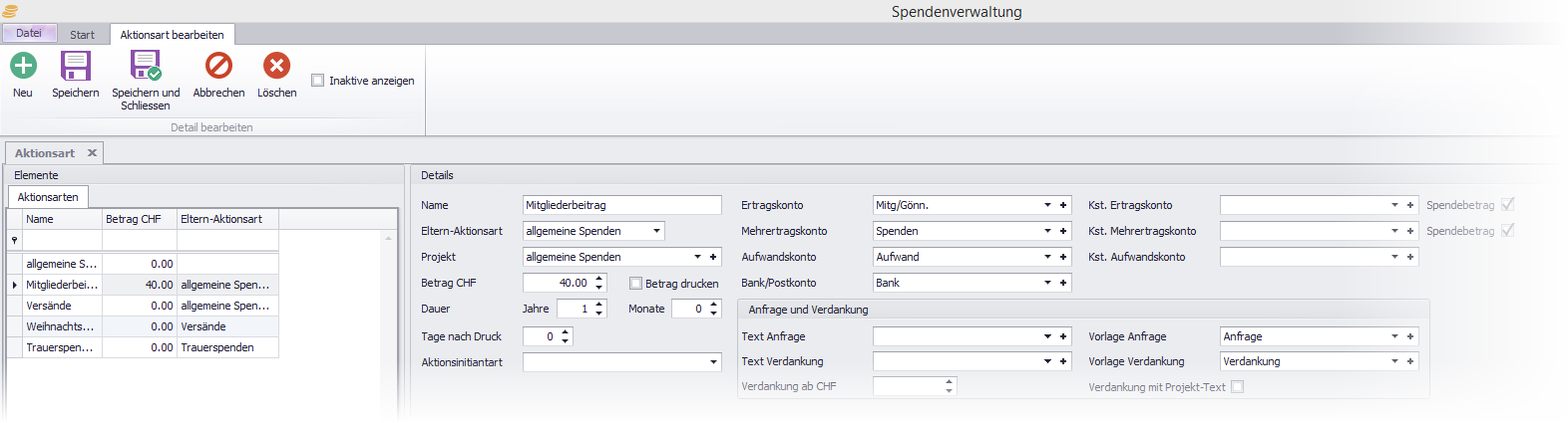 Hier erhält man eine Übersicht über alle bereits bestehenden Aktionsarten. Es können neue erstellt oder bestehende gelöscht werden. Aktionsarten dienen als Vorlage für Spendenaktionen. Die Felder werden entsprechend bei der Erstellung einer Spendenaktion von der Aktionsart übernommen. Das gewählte Projekt wird ableitenden Spendenaktionen automatisch zugewiesen. Alle Einstellungen, welche in der Aktionsart vorgenommen werden, können in der Spendenaktion überschrieben werden.