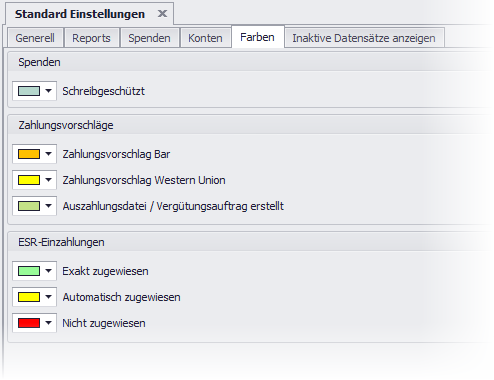Kann eine ESR-Einzahlung einer Spende oder Spendenaktion exakt zugewiesen werden, erhält diese die entsprechende Farbe. ESR-Einzahlungen, welche exakt zugewiesen werden können, führen zu einer Mutation eines Eintrags in den Spenden.