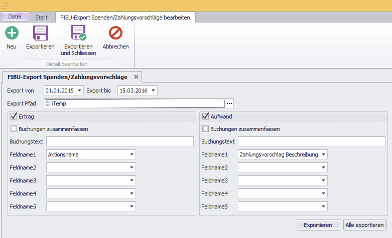 Die Zusammenfassung findet folgendermassen statt: Spenden werden zusammengefasst, wenn Valutadatum, Aufwandkonto und Ertragskonto übereinstimmen. Für den Export gilt der Spendebetrag mit Ertragskonto als Buchung und der Mehrbetrag und das Mehrertragskonto gilt als weitere Buchung. Mehrbetragsbuchungen werden also ebenfalls mit Buchungen zusammengefasst, wenn Valutadatum, Aufwandkonto und Mehrertragskonto mit einer Buchung übereinstimmen. Zahlungsvorschläge werden zusammengefasst, wenn Valutadatum, Aufwandkonto und Ertragskonto übereinstimmen.