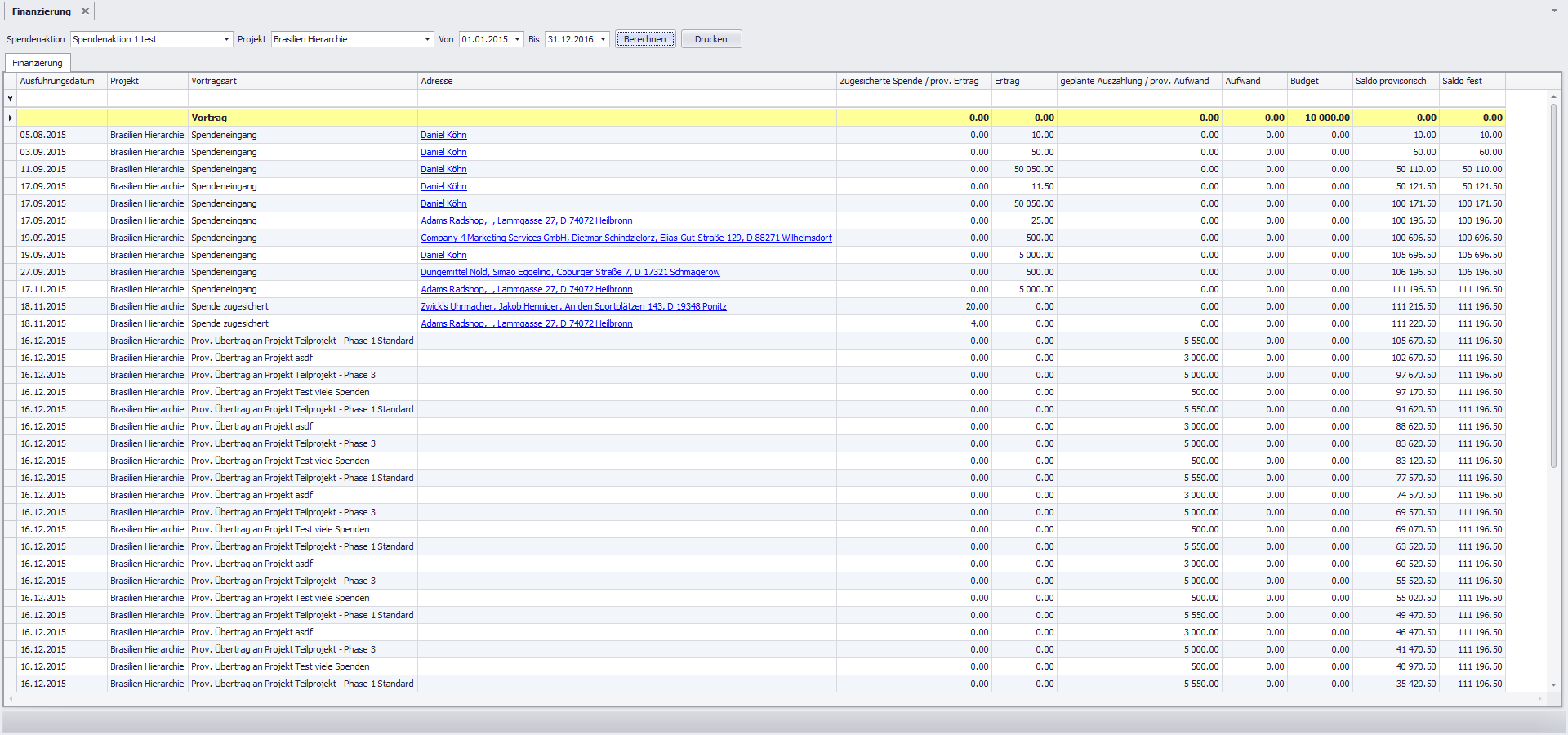Hier erhalten Sie über den gewählten Zeitraum eine Übersicht über die Finanzierung. Wird keine Spendenaktion und kein Projekt ausgewählt, werden beim Berechnen, alle Projekte angezeigt. Sie können sich auch nur alle Projekte von einer Spendenaktion oder ein bestimmtes Projekt anzeigen lassen.