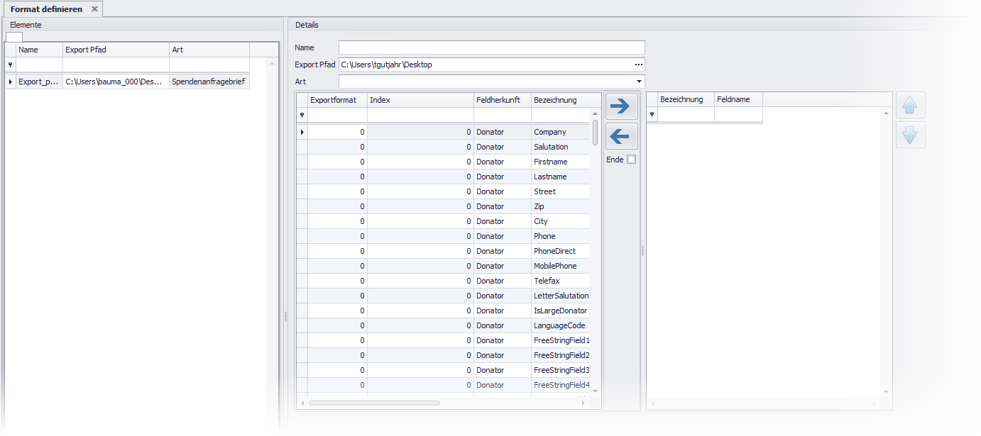 In der linken Tabelle sind die zur Auswahl stehenden Felder aufgelistet. Per Doppelklick oder Benutzung der Pfeilschaltflächen können die gewünschten Felder in die rechte Tabelle übernommen werden. Hier kann die Reihenfolge der Felder mittels Pfeilschaltflächen angepasst werden. Die Feldbezeichnung kann frei gewählt werden und wird beim Export anstelle des Feldnamens benutzt. Wird das Auswahlfeld „Ende“ aktiviert, so werden die links gewählten Felder am unteren Ende der rechten Tabelle eingefügt, ansonsten werden diese am oberen Ende eingefügt.