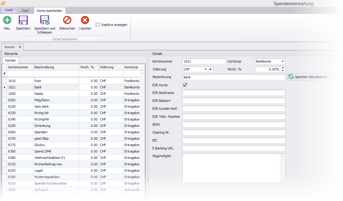 Zeigt eine Übersicht über alle bereits bestehenden Konten an. Über Neu kann ein neues Konto erstellt oder mit Löschen ein bestehendes Konto gelöscht werden. Bei der Neuanlage können alle notwendigen Informationen über das Konto hinterlegt werden.
