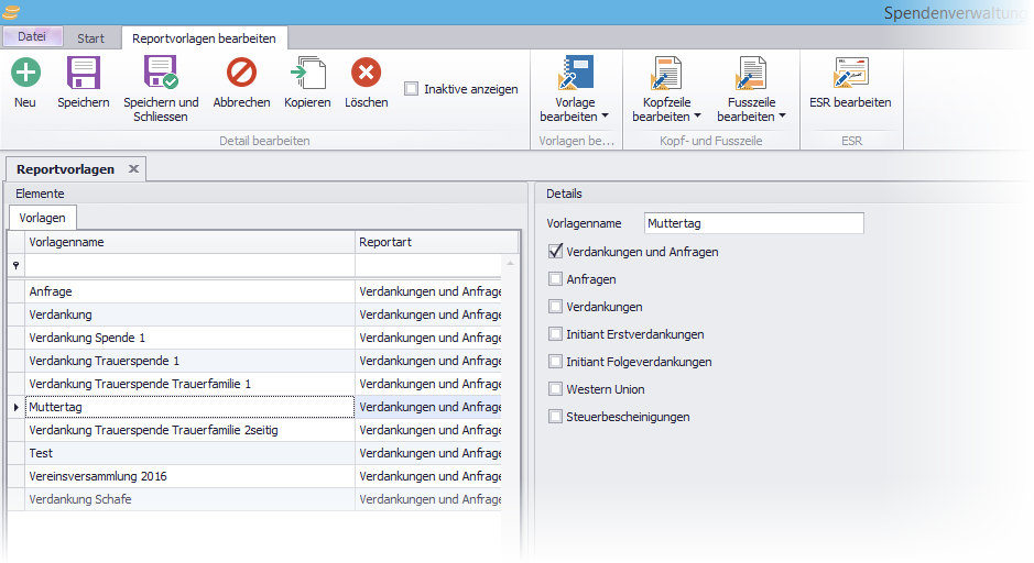 Pro Report-Vorlage muss mindestens eine Vorlagenart definiert werden. Wird „Verdankungen und Anfragen“ gewählt, so gilt die Vorlage für Anfragen, Verdankungen sowie für Initiant Erst- und Folgeverdankungen. Report-Vorlagen werden am Einsatzort, beispielsweise auf der Spendenaktion, nach der erwarteten Vorlagenart gefiltert.