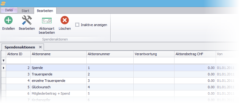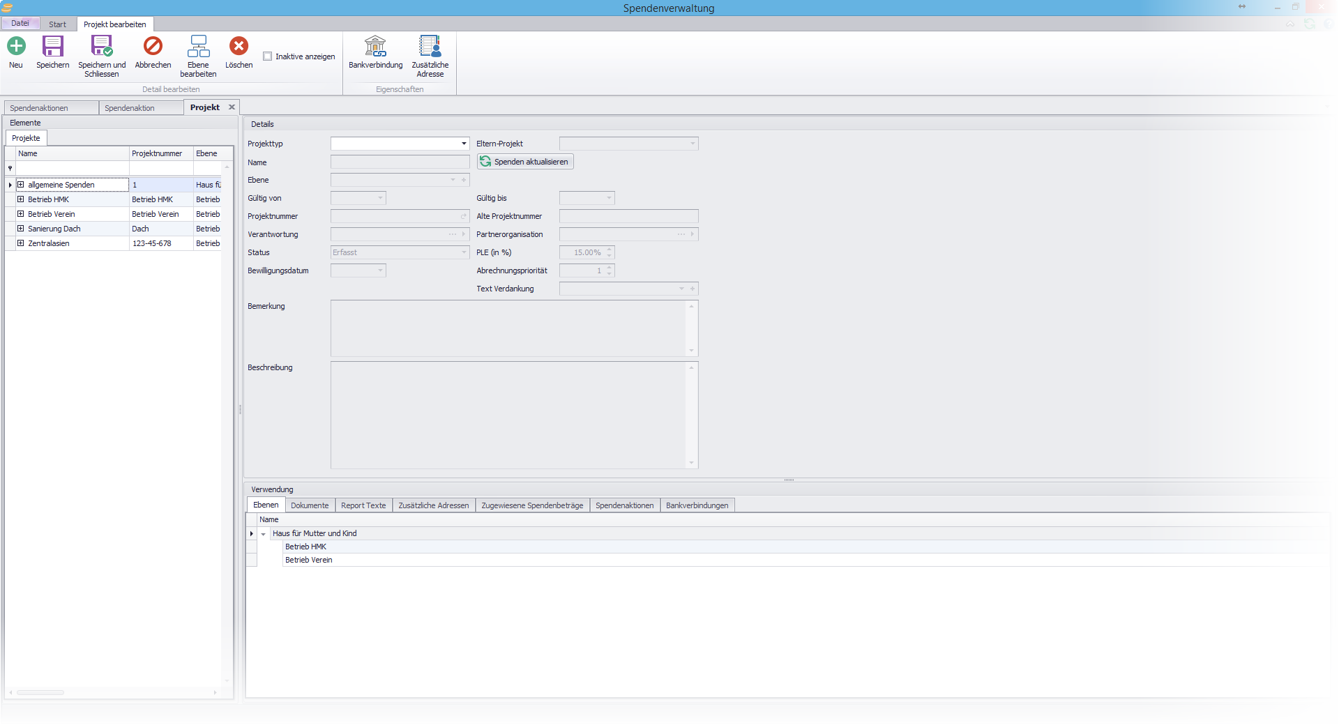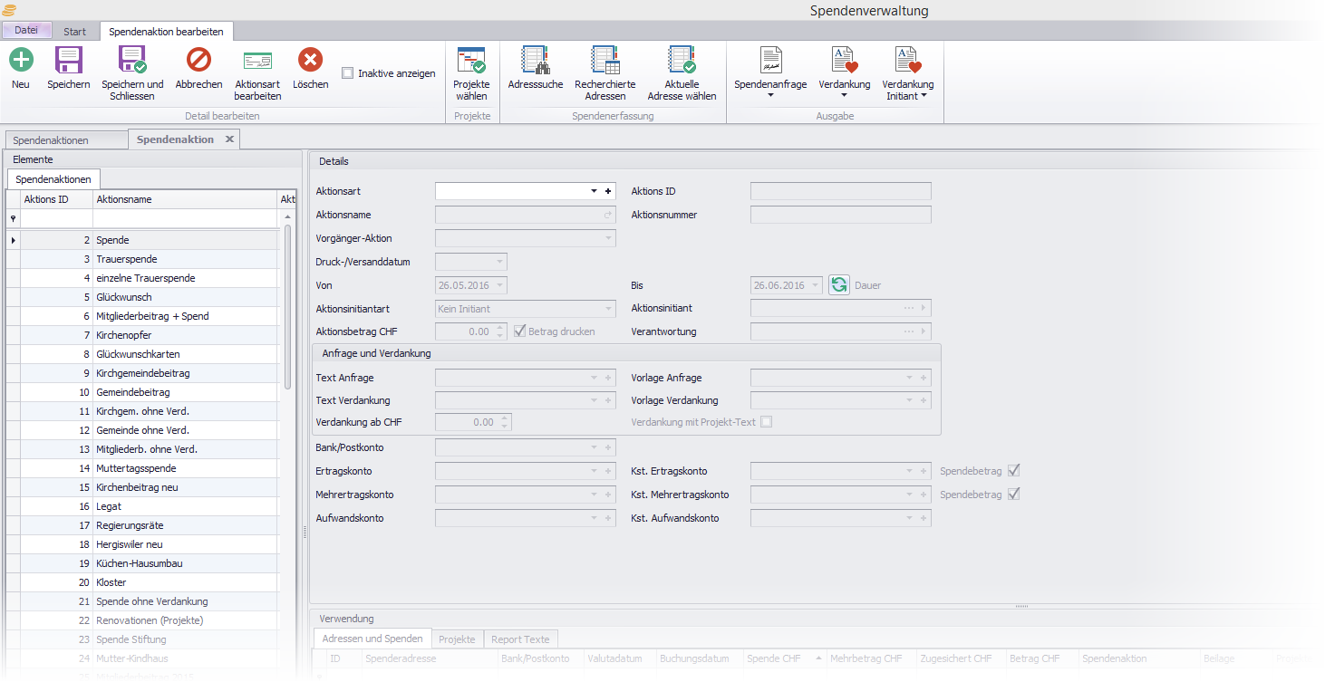 Bevor Spendenaktionen erfasst werden können, müssen im Vorfeld die Projekte und Aktionsarten definiert sein.