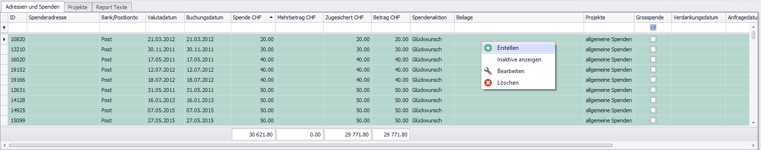 Über das Kontextmenü kann eine Spende bearbeitet, neu erstellt oder gelöscht werden.