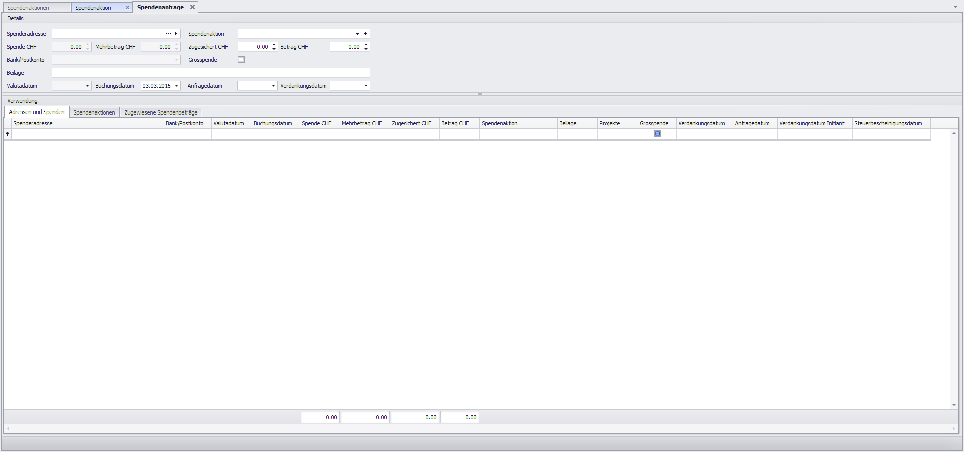 | Aktionsbetrag CHF | Der Betrag, welcher beim Auswählen von Adressen für Spendenanfragen als angefragter Betrag CHF übernommen werden kann. |