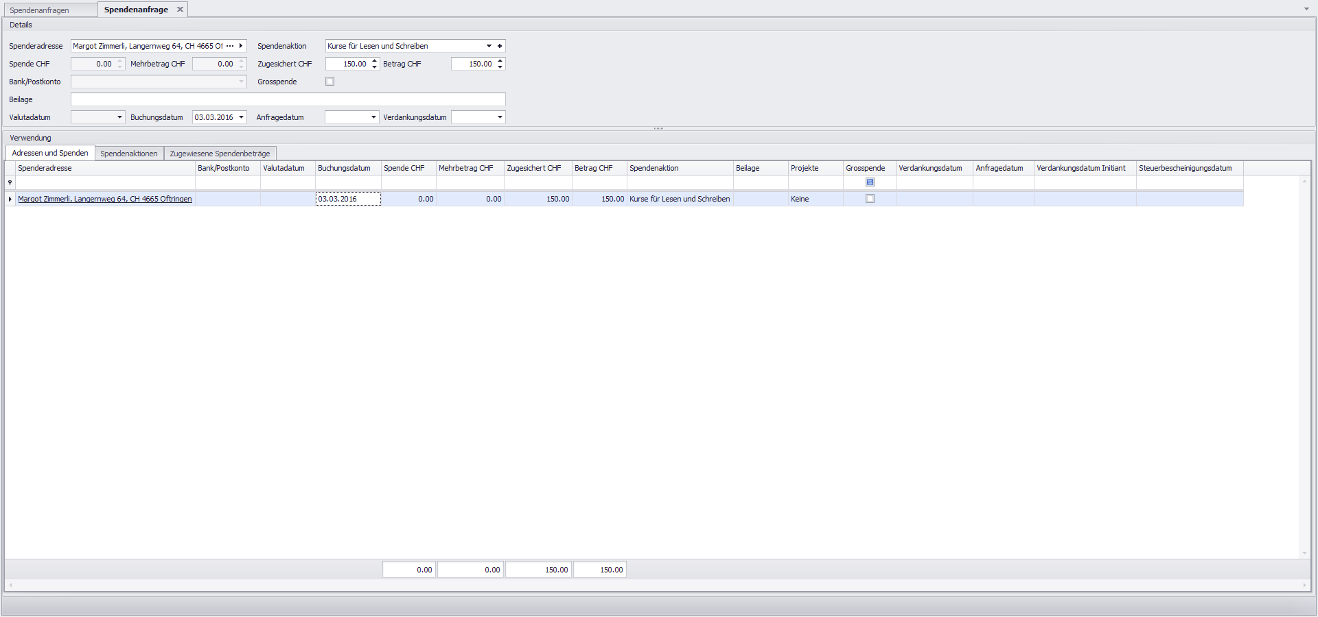 | Zugesichert CHF | Falls der Spender bereits einen Betrag zugesichert hat, kann dieser hier erfasst werden. |