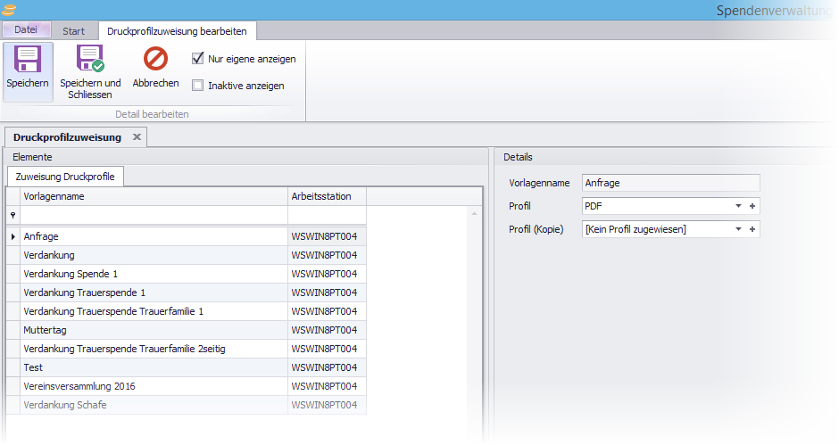 Druckprofile werden pro Arbeitsstation erfasst. Um Druckprofile von anderen Arbeitsstationen einzusehen, kann im Menü „Nur eigene anzeigen“ deaktiviert werden.