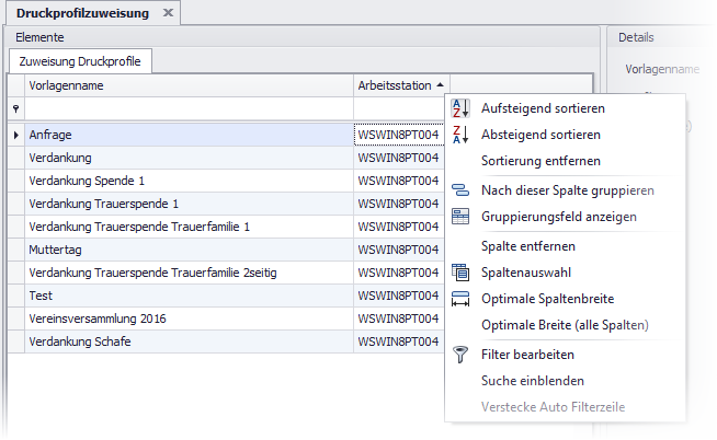 Um zu sehen, zu welcher Arbeitsstation ein Profil gehört, kann die Spalte „Arbeitsstation“ eingeblendet werden. Um eine Spalte einzublenden wird mittels Rechtsklick auf einen Spaltentitel der Befehl „Spaltenauswahl“ ausgeführt.